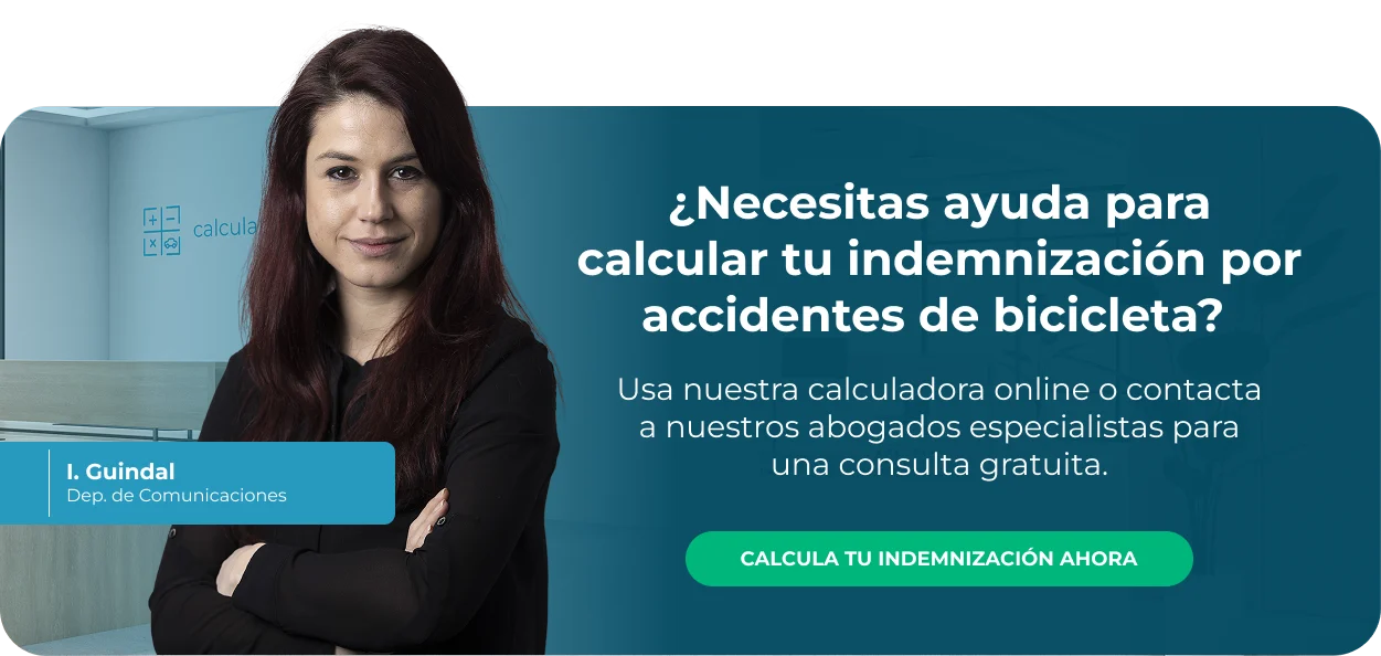 La indemnización por accidente de bicicleta es la compensación económica que tienen derecho a recibir las víctimas de accidentes en los que esté involucrada una bicicleta. Según la Ley 35/2015 (Baremo de Tráfico), se calcula en función de los daños personales, materiales y perjuicios económicos sufridos. En Calculatuindemnización, nuestros abogados especialistas en accidentes te guían para calcular tu indemnización por accidente de bicicleta y reclamar lo que te corresponde.